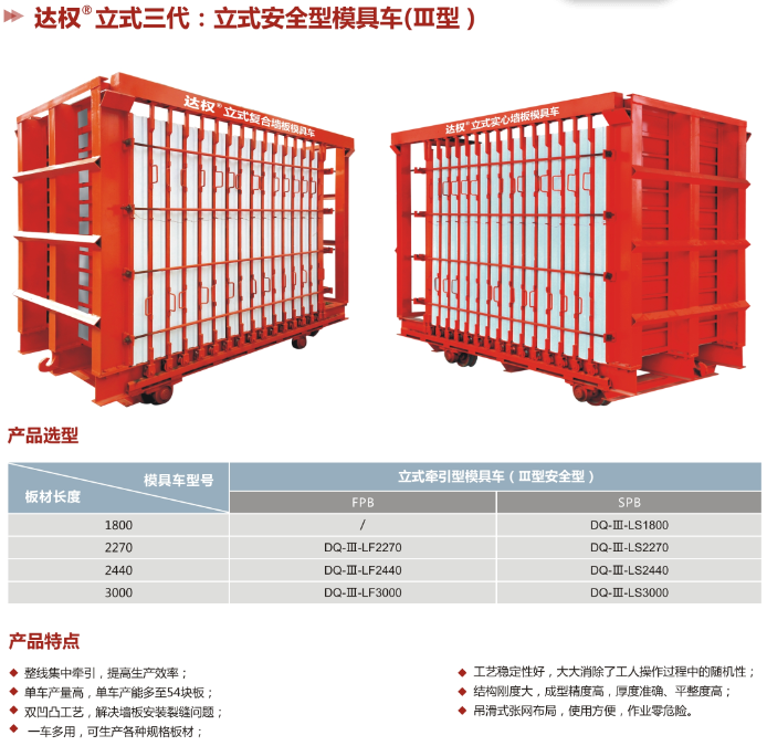 達權復合夾芯板立式模具車是達權首創的立式模具車,用于生產輕質復合夾芯板,改變了傳統的臥式模具車生產形式,相對于傳統復合夾芯板臥式車,立式模具車更利于倒模拆模,大大提高了生產效率,降低了人工成本。性能已達到國際同類產品的領先水平。免費提供本公司品牌、商標、工藝流程的技術培訓,為建廠公司(合作廠家)全方位提供生產、安裝、銷售的扶持及服務。